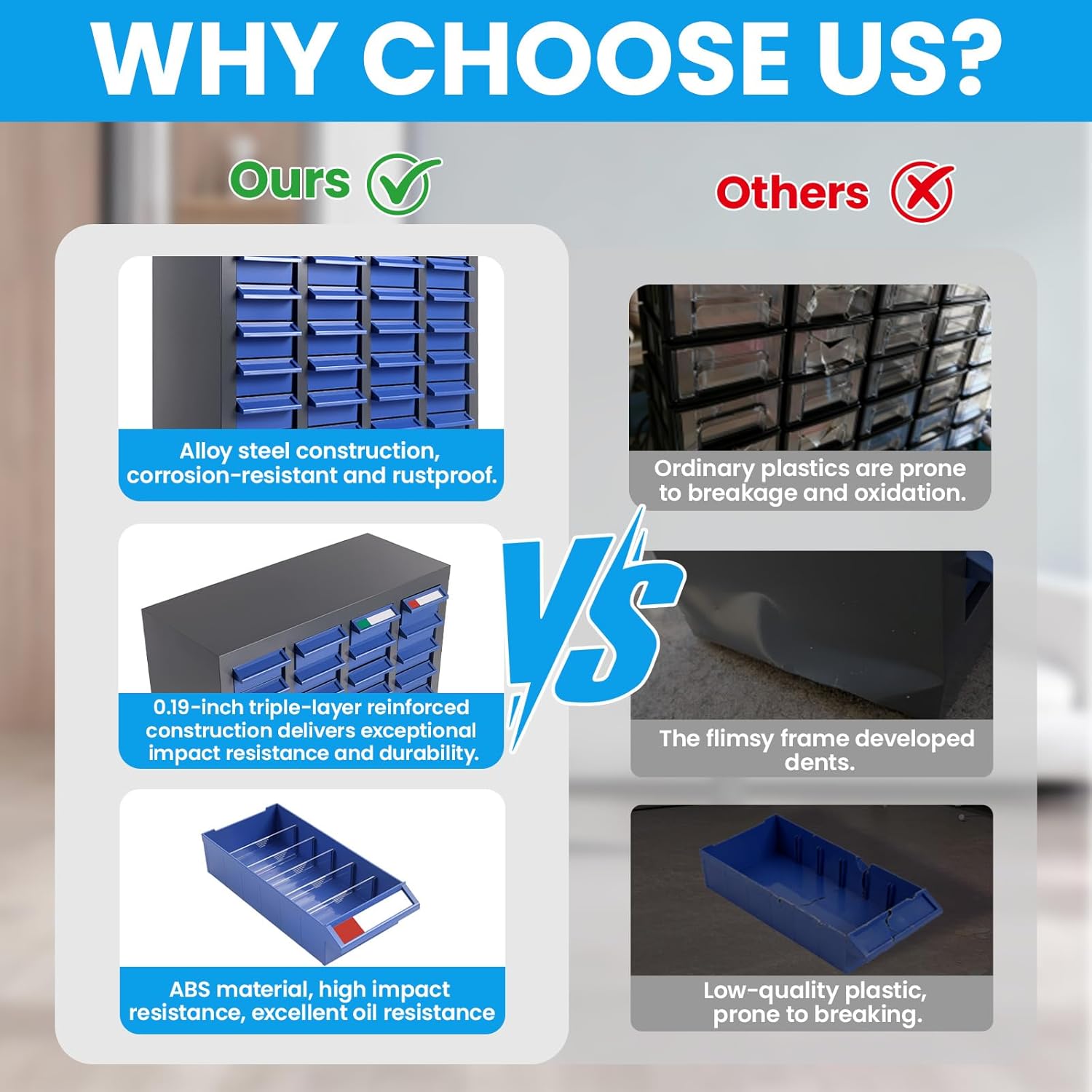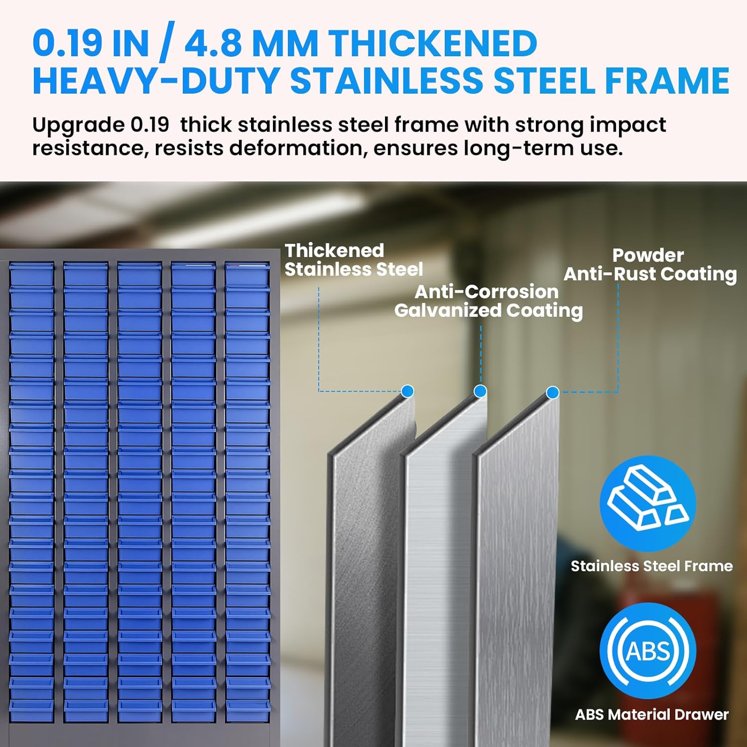 The nut and bolt organizer is made of 0.19in/4.8mm thickened alloy steel frame and galvanized coating, which is rust-proof and corrosion-resistant, sturdy and easy to clean. The drawers are made of ABS material, which is sturdy and impact-resistant to ensure safe and stable use.