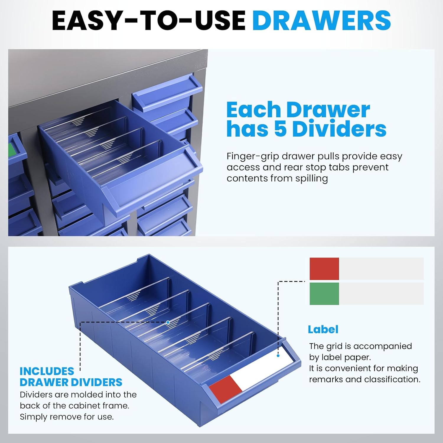 • In each drawer of the bolt organizer, there are 5 movable dividers(In total 500 dividers) that can be easily used to store items of different sizes, such as bolts and nuts organizing and storing, toys, hardware, parts and small items. This helps to say goodbye to disorganization.