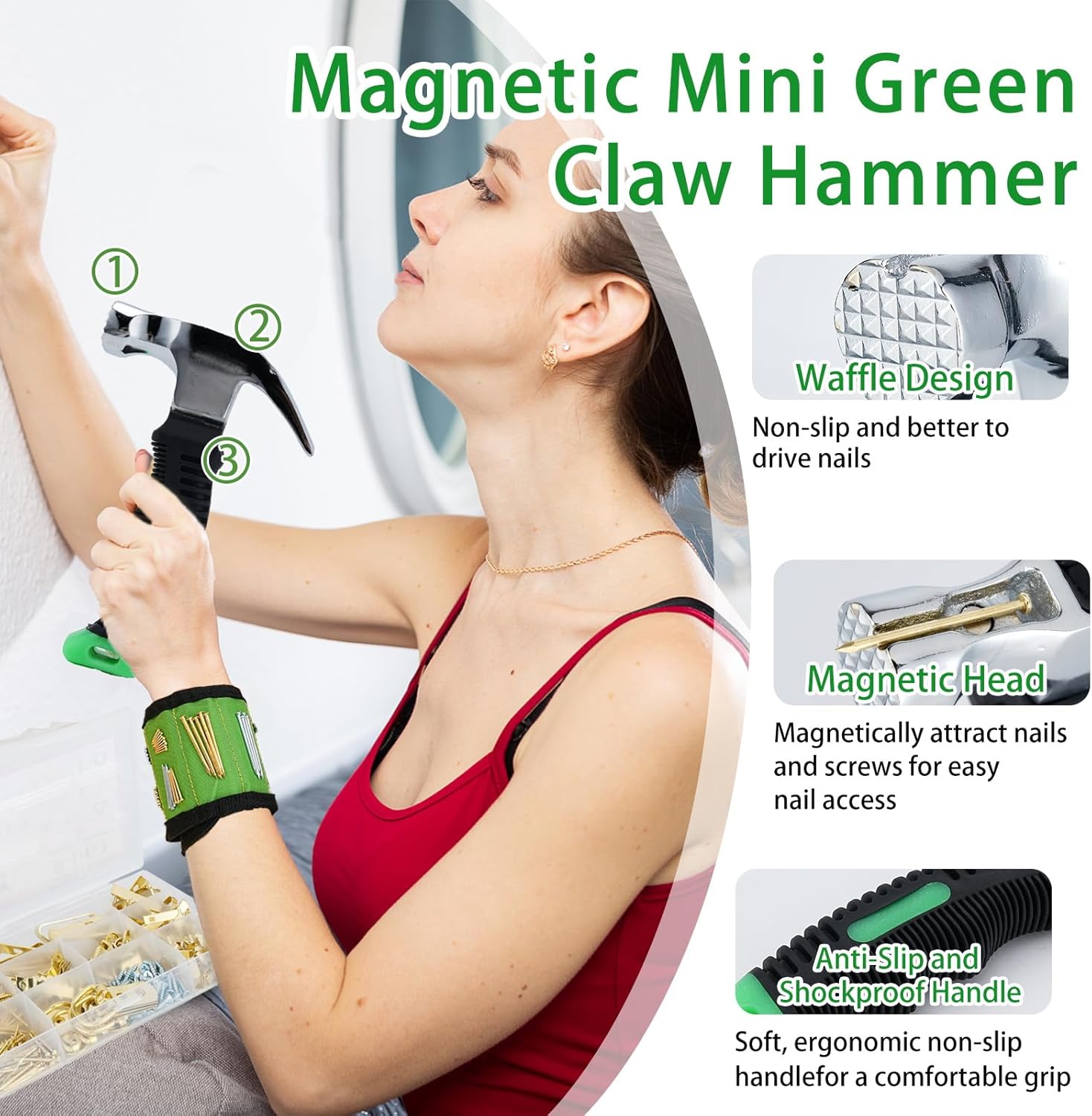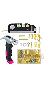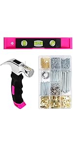 This hanging kit is suitable for various wall decor, including picture frames, canvases, and other decorative items. It is an ideal solution for people who want to decorate their homes with ease and convenience. With this kit, you can hang your items confidently and easily without the need for professional assistance. It includes a pink mini hammer with a magnetic head and a magnetic level for accurate hanging.
