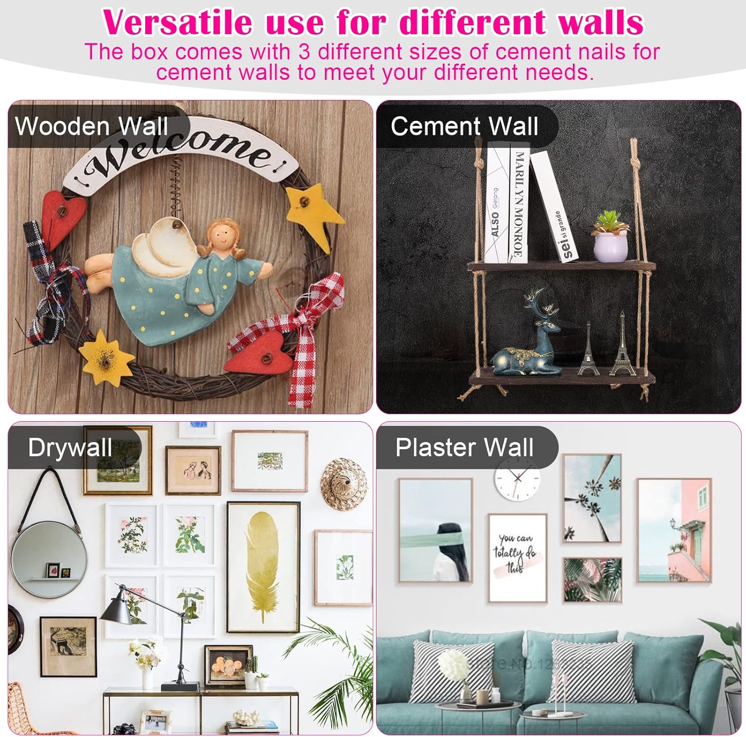 This picture hanging kit can be used on wood, plaster, drywall, and cement walls. It comes with sturdy and reliable cement nails that can withstand heavy items on cement walls.