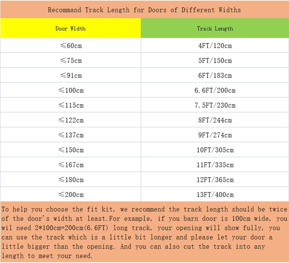 To help you choose the fit kit, we recommend the track length shoulde be twice of the doors width at least, and you can also cut the track into any length to meet your need.
