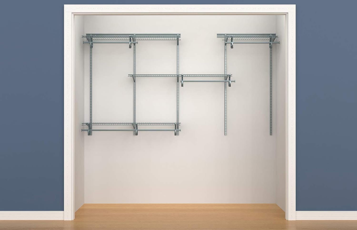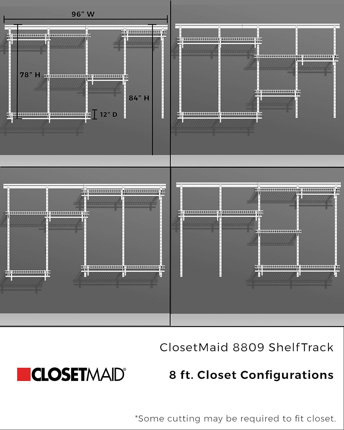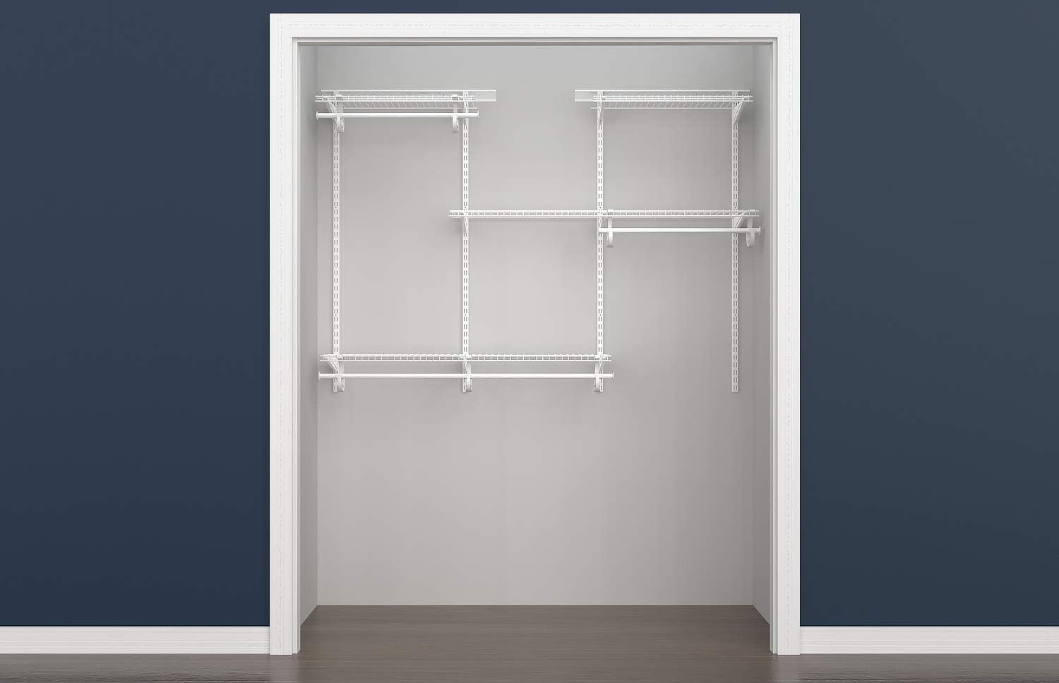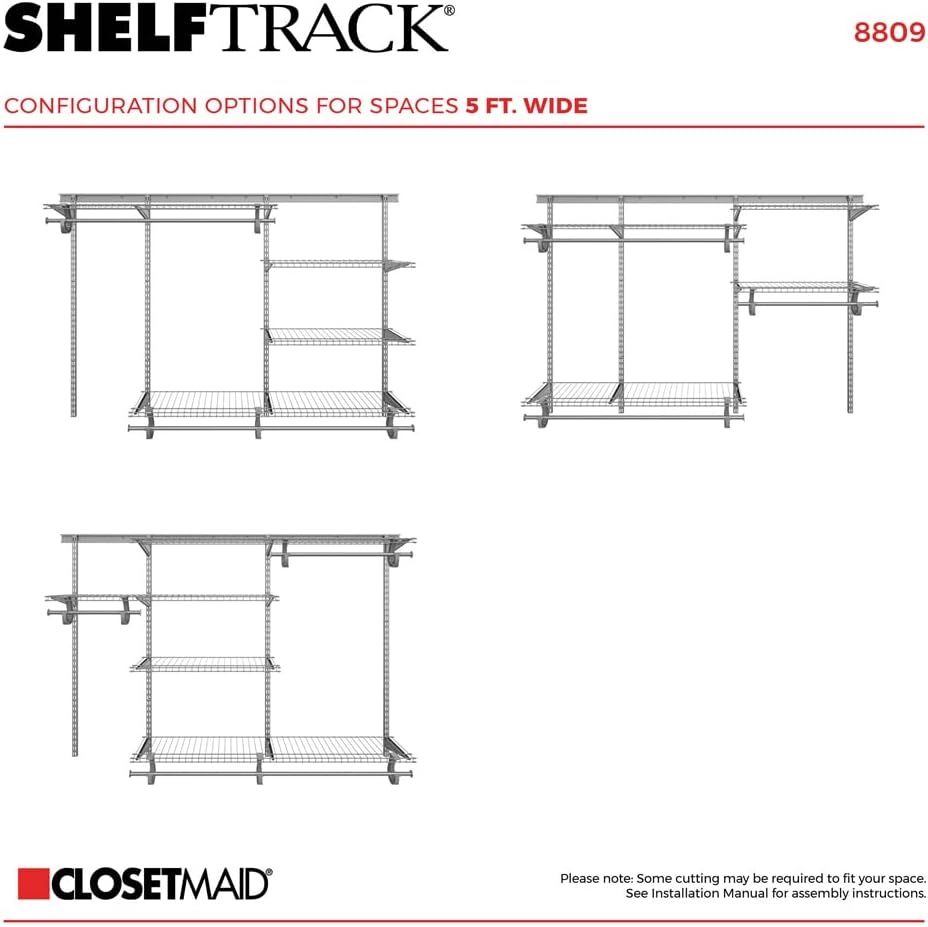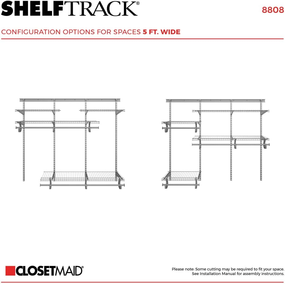 This versatile ventilated wire shelf organizer features several configuration options depending on your closet size. For spaces less than 5 ft. wide, some shelf or hang track cutting may be required.