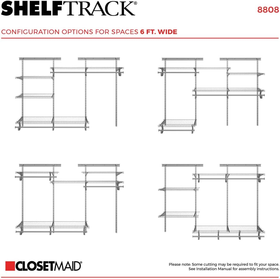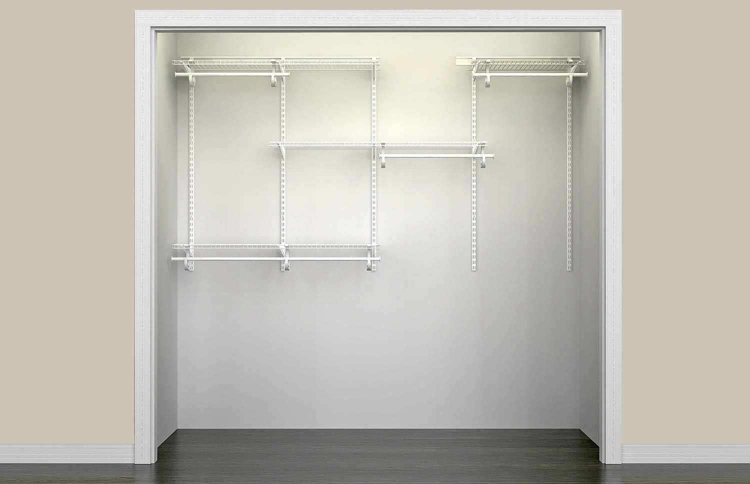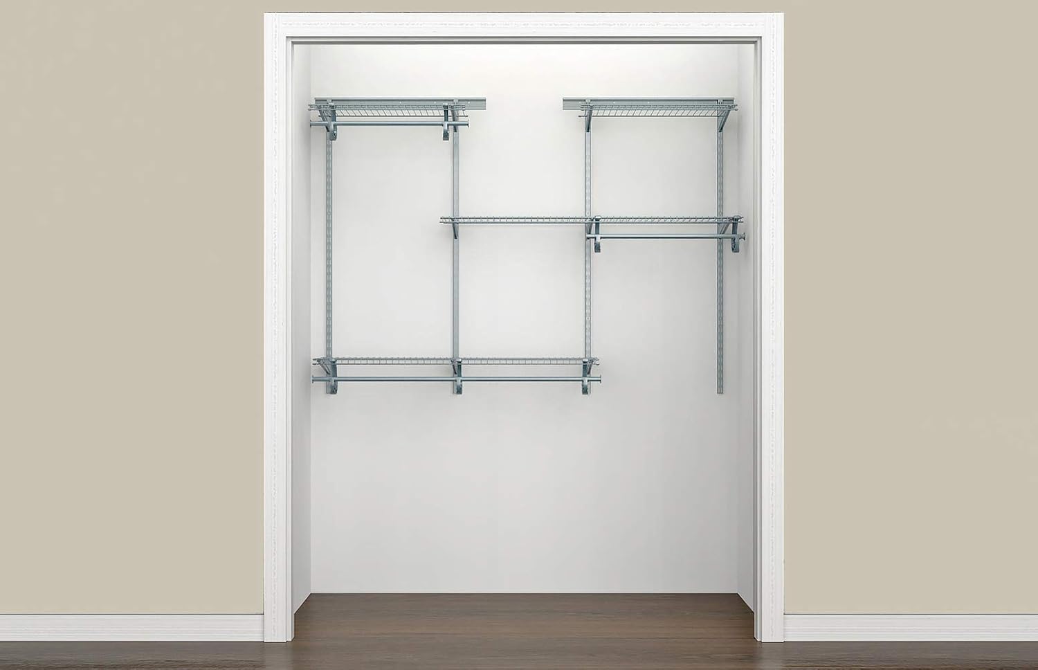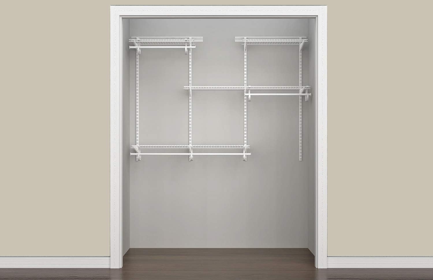 This versatile ventilated wire shelf organizer features several configuration options depending on your closet size. For spaces less than 5 ft. wide, some shelf or hang track cutting may be required.
