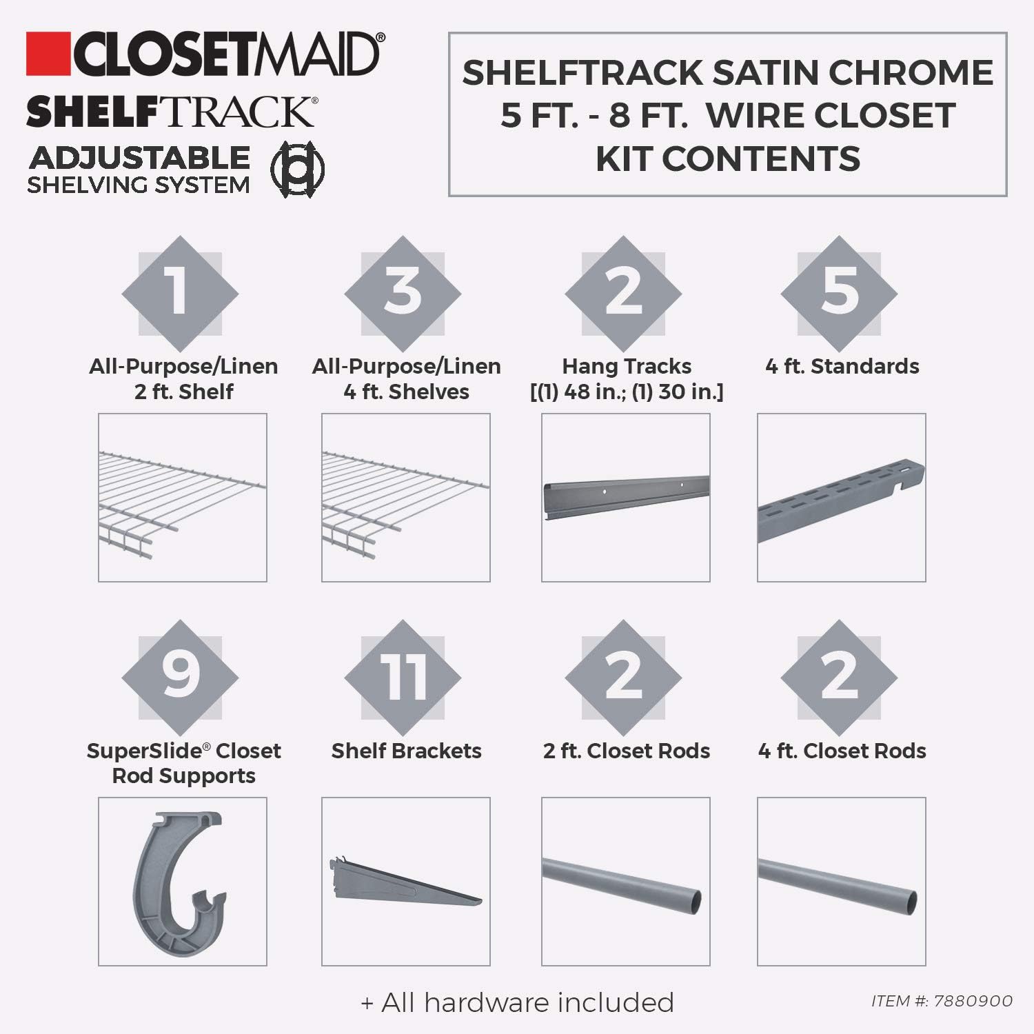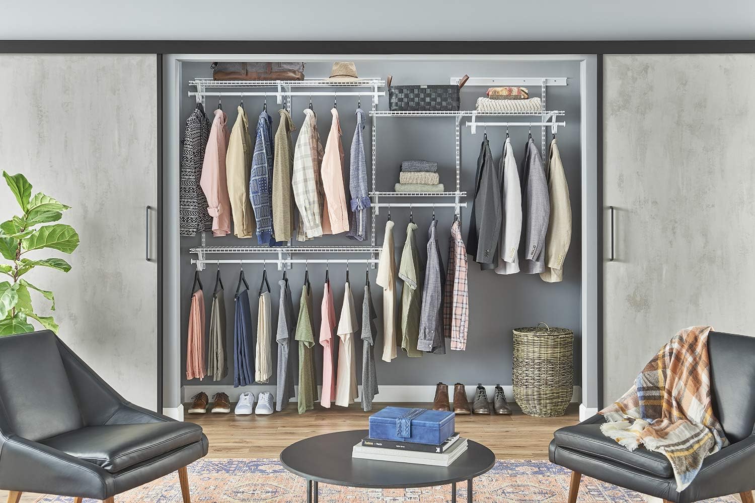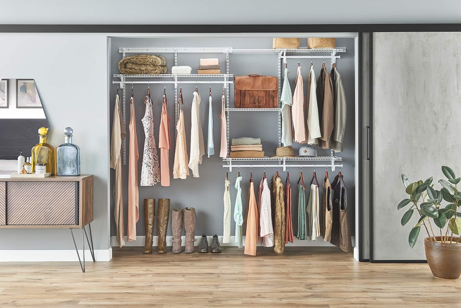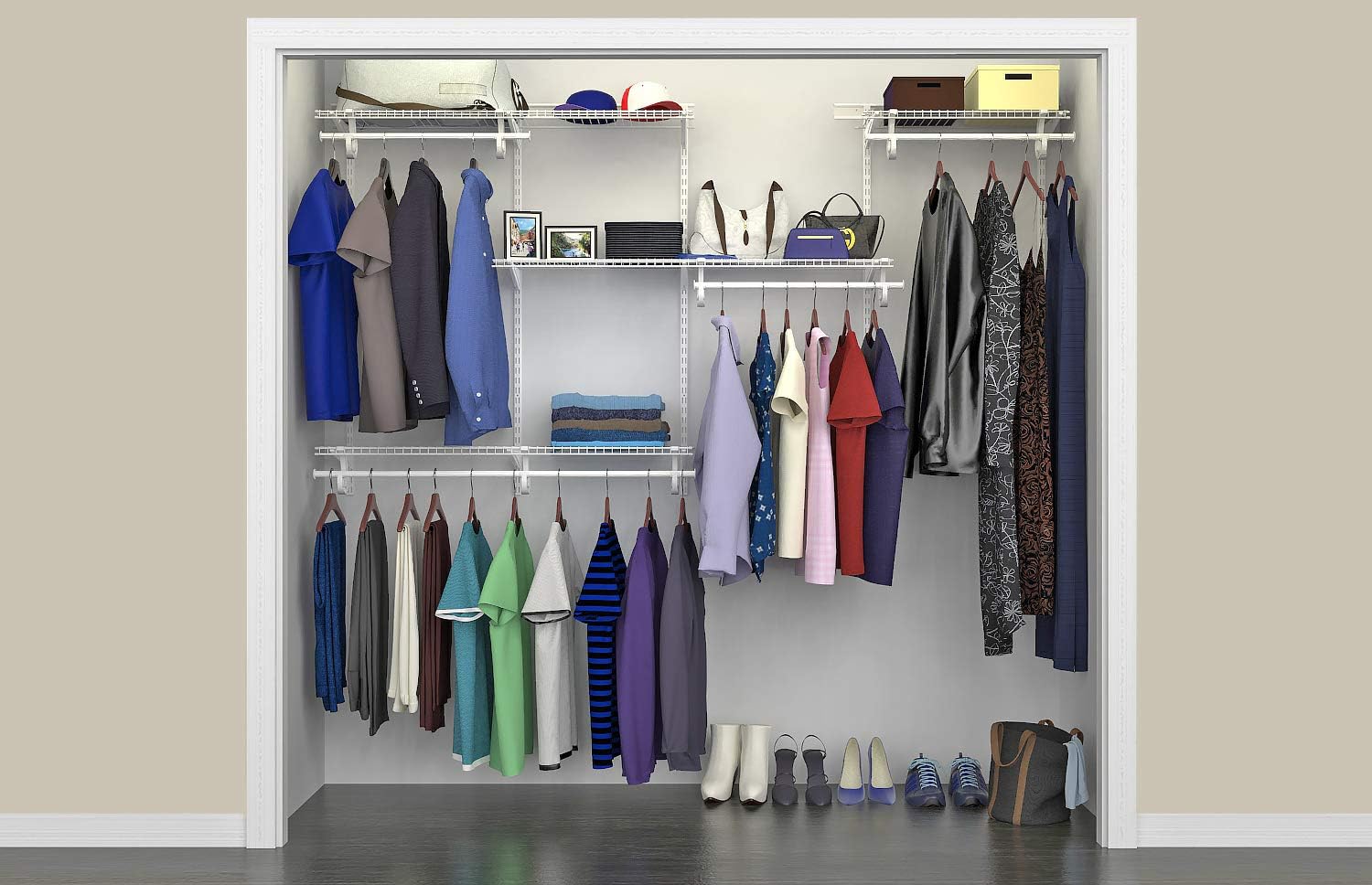 This versatile ventilated wire shelf organizer features several configuration options depending on your closet size. For spaces less than 5 ft. wide, some shelf or hang track cutting may be required.