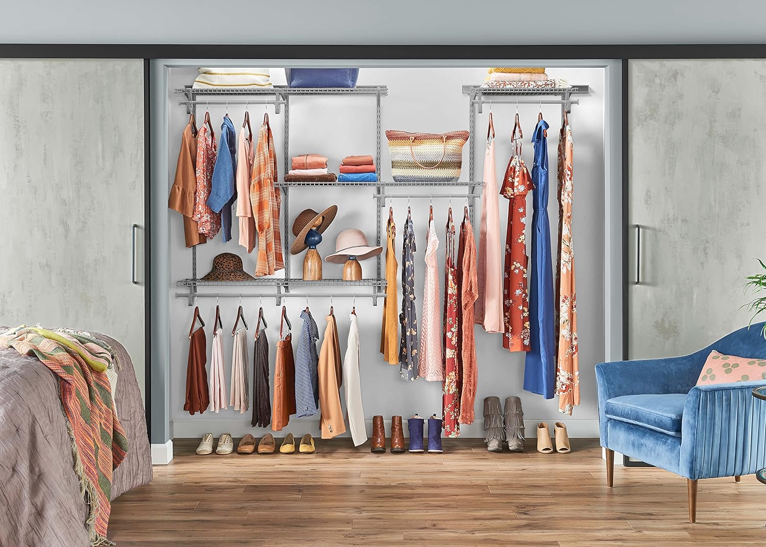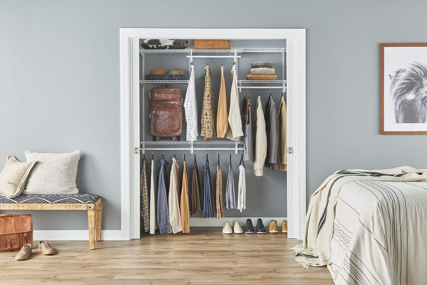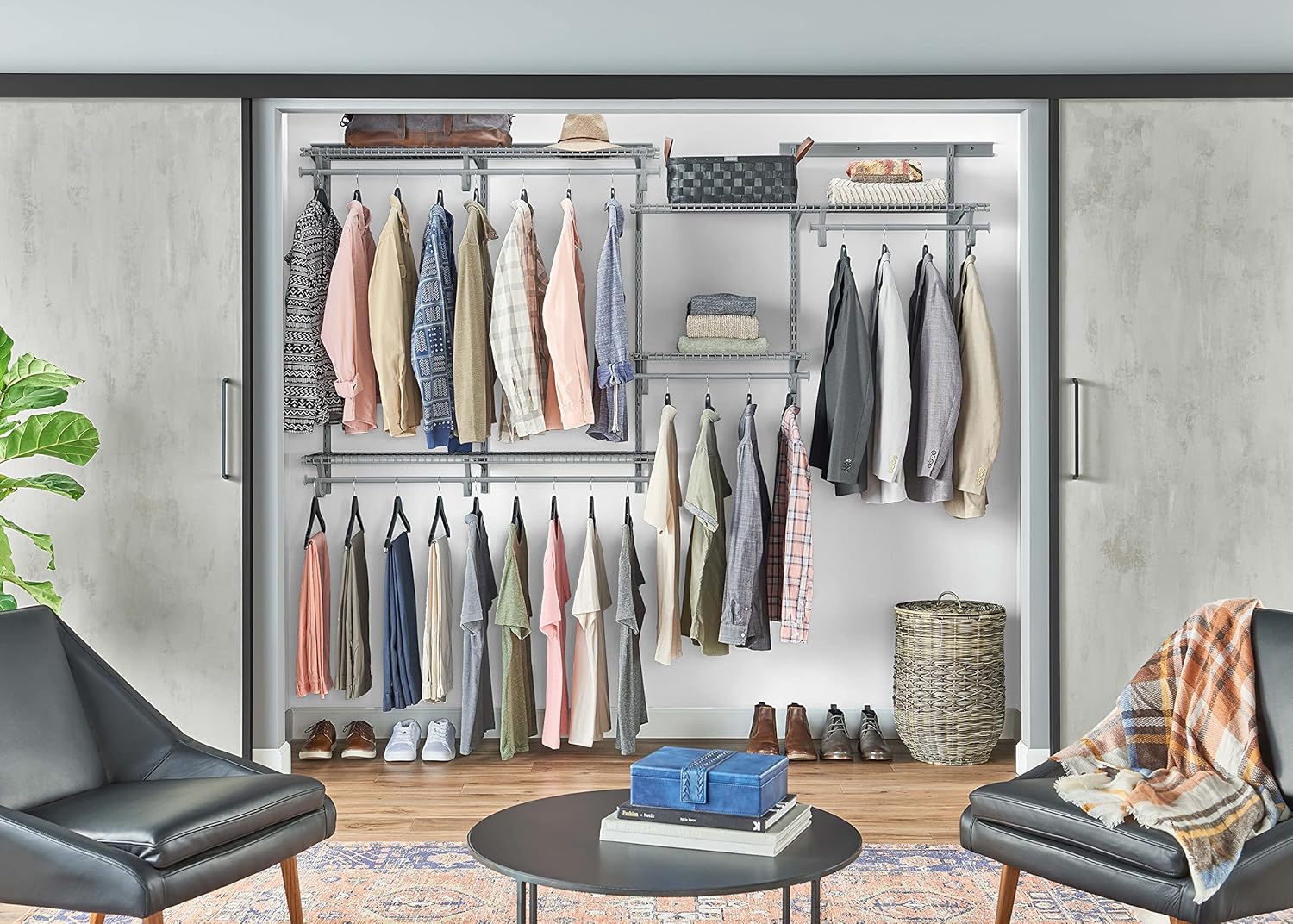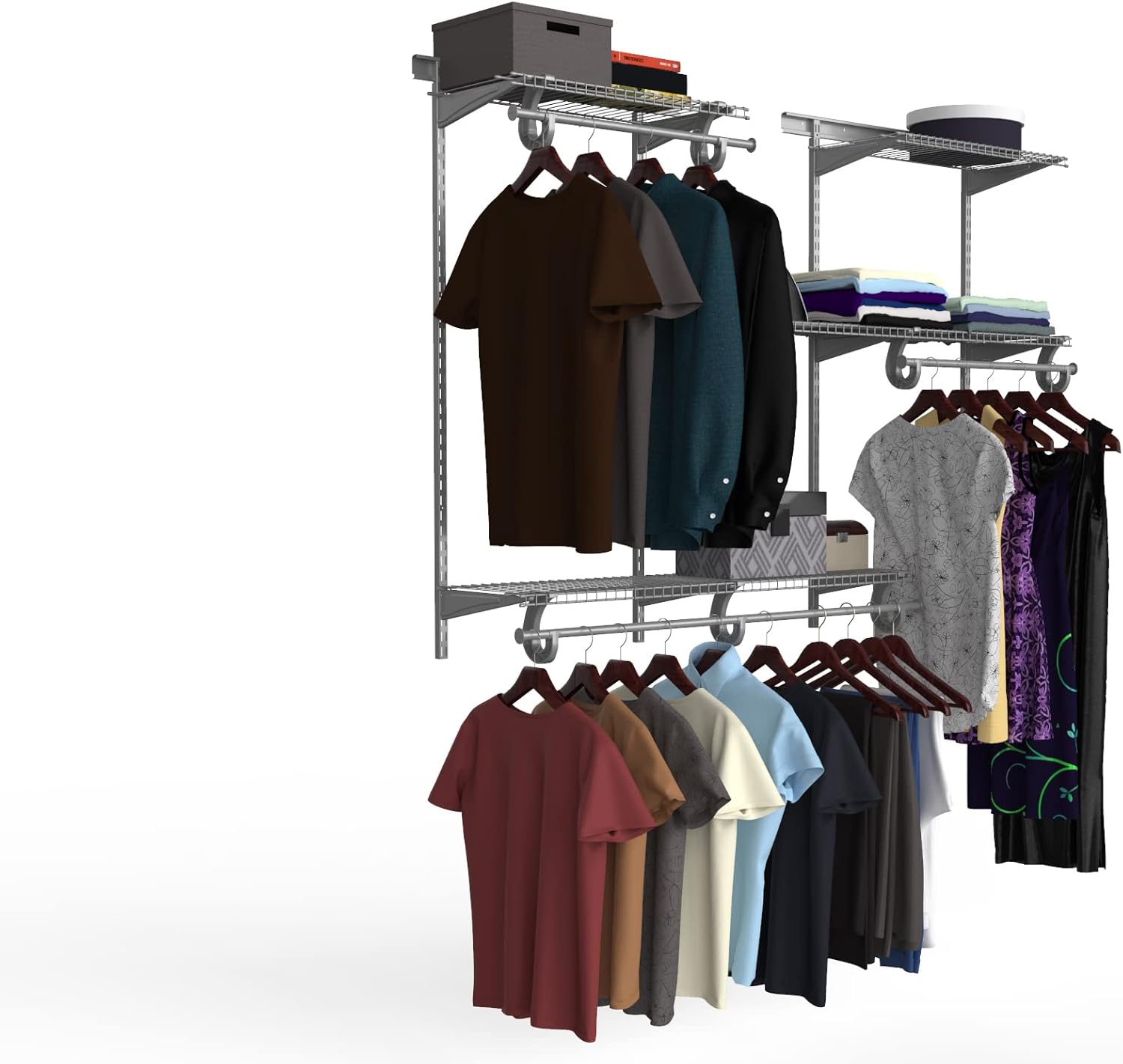 This versatile ventilated wire shelf organizer features several configuration options depending on your closet size. For spaces less than 5 ft. wide, some shelf or hang track cutting may be required.