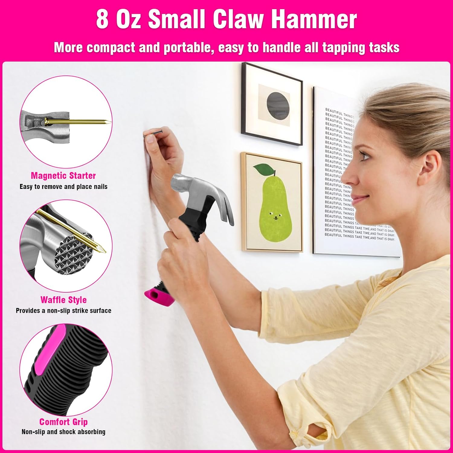 - Easy to Use: The pink mini claw hammer with magnetic head is small, compact and comfortable to hold, making it easy for you to secure and hammer nails with ease. When everything is ready, hang the picture frame and finally use the magnetic level to precise the angle to ensure perfect alignment.