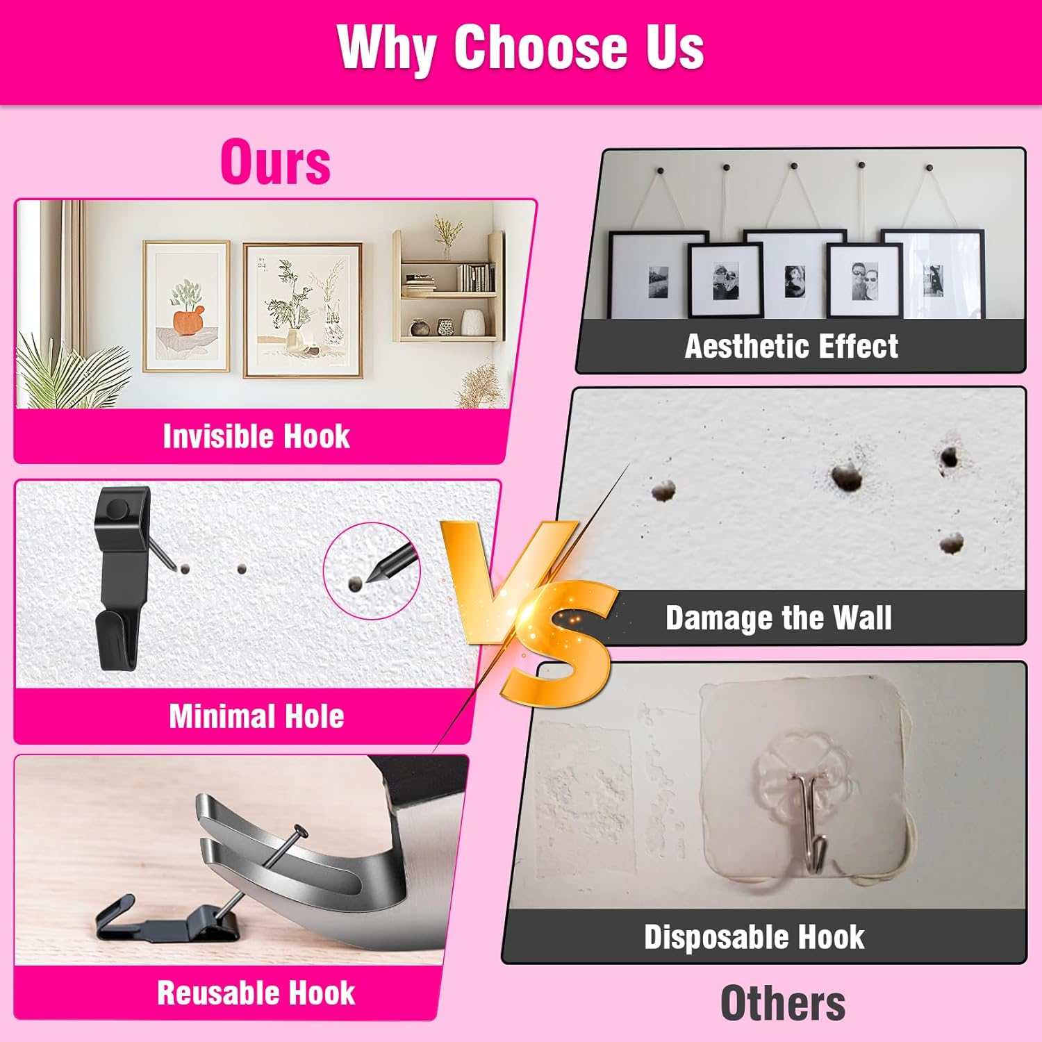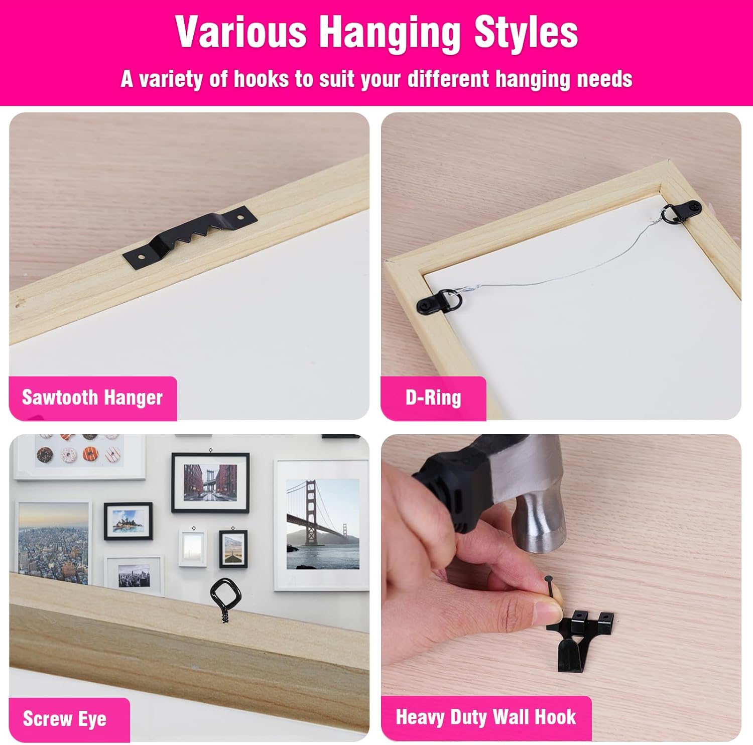 - Suitable Wall Types: This wall hanging kit is compatible with drywall, wood and plaster wall surfaces (Note: No applies to concrete or ceramic walls). After removing, the hooks leave only a small hole, easy to repair and reuse. Convenient for you to decorate a variety of small objects on the wall, perfect for homeowners, renters and DIY decorating enthusiasts.