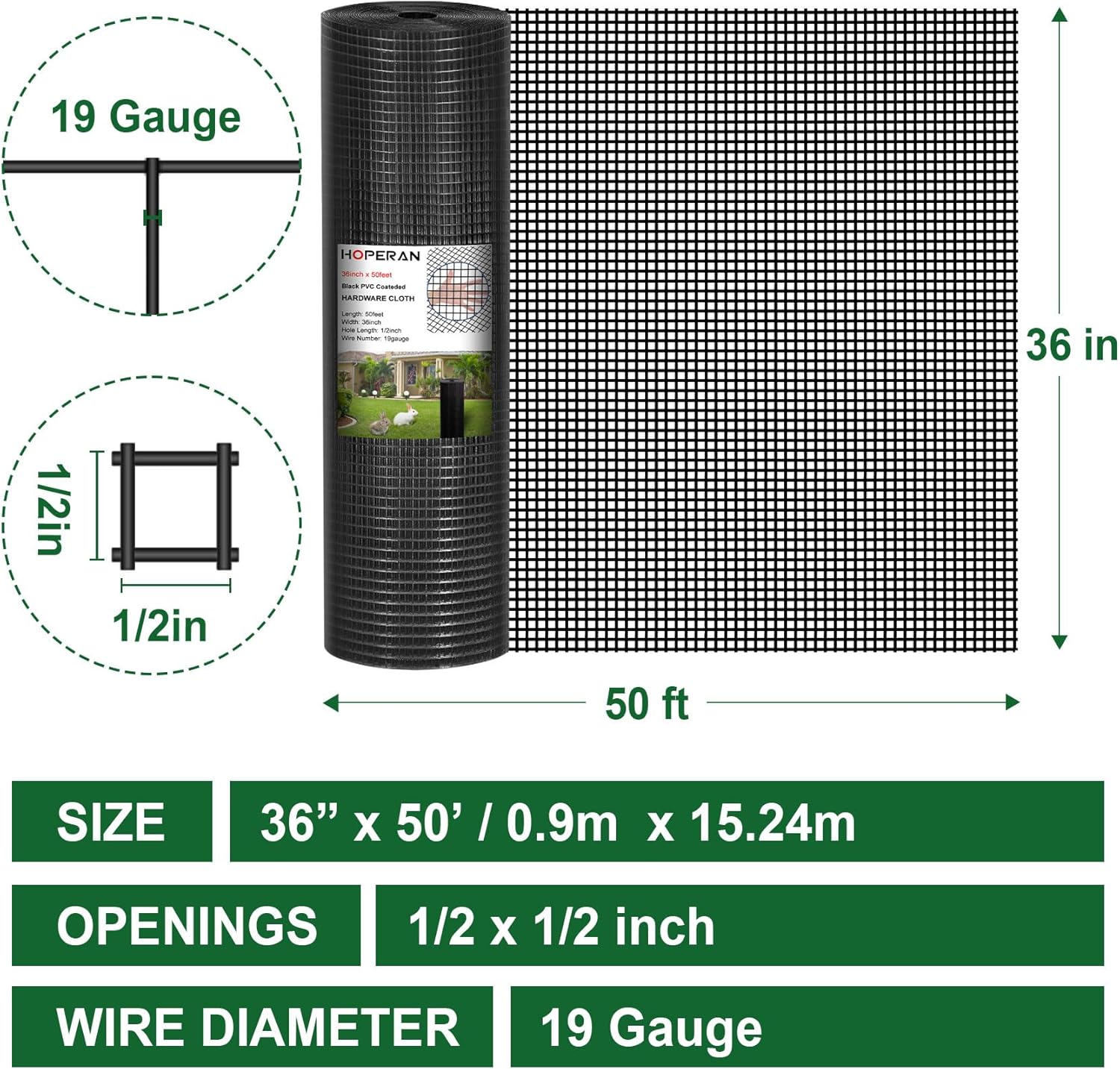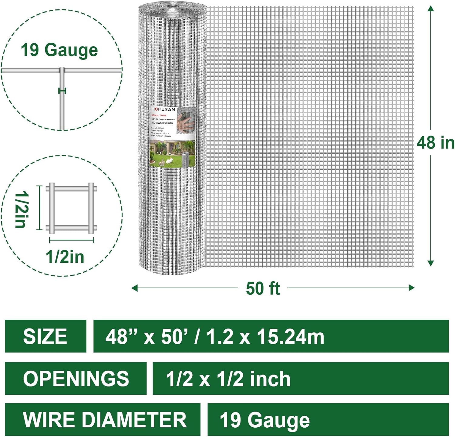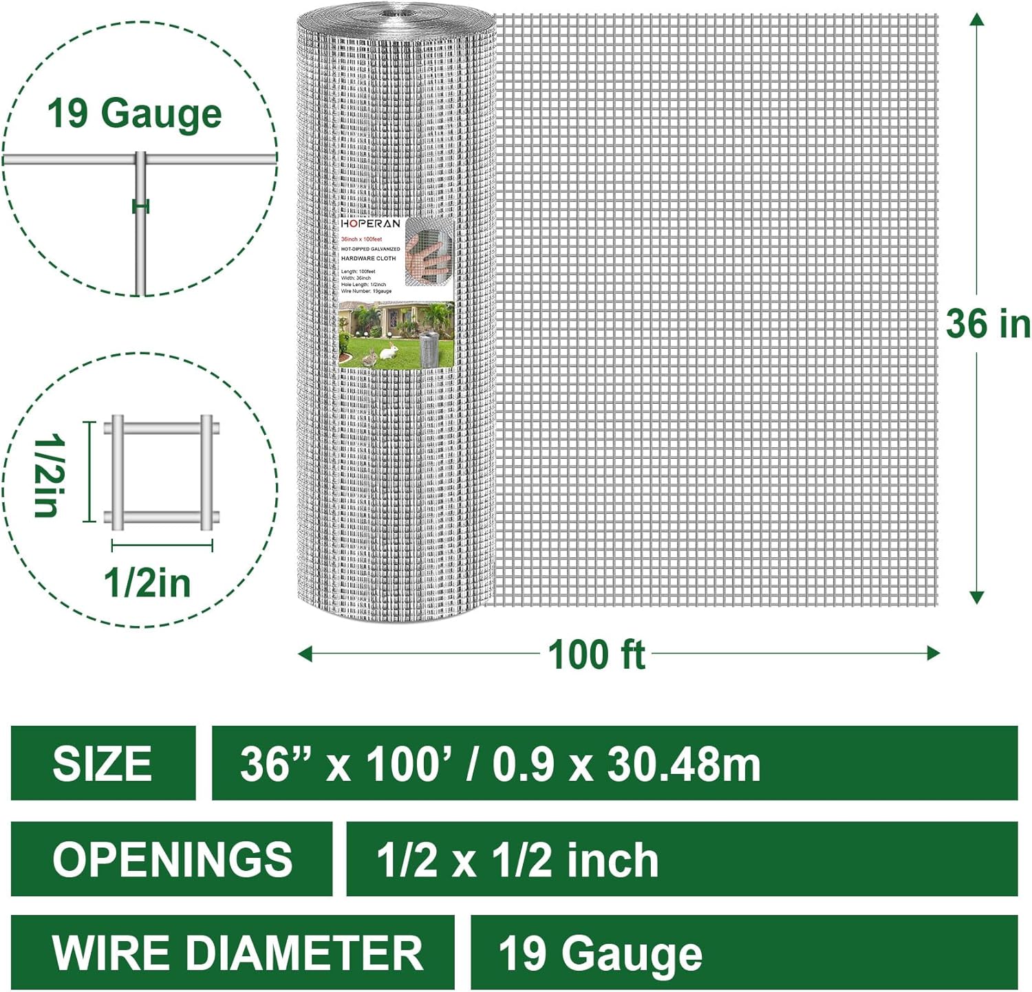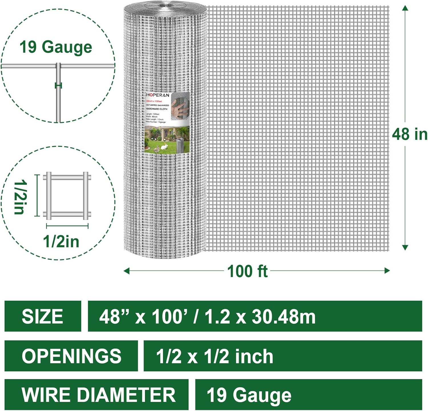 Perfect Size Design: The hot-dipped galvanized hardware cloth comes in a length of 50 feet (15.24 meters) and a width of 3 feet (0.914 meters). With standard 1/2-inch (12.7 mm) mesh openings and a wire diameter of 19 Gauge, the size design is perfect, meeting various application requirements