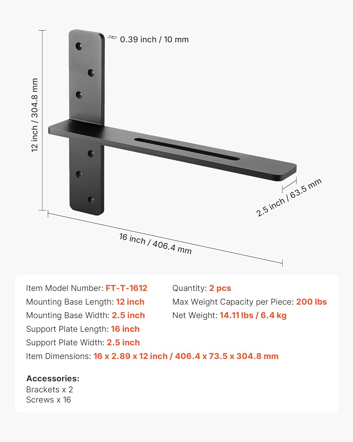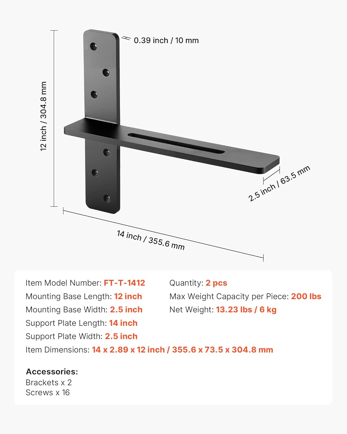Shelf Brackets 2 Pcs, 200 lbs/90 kg Weight Capacity, 14x2.89x12 in / 355.6x73.5x304.8 mm, Solid Steel Heavy Duty Brackets for Shelves, Countertop Support Floating Bracket Hardware with Screws