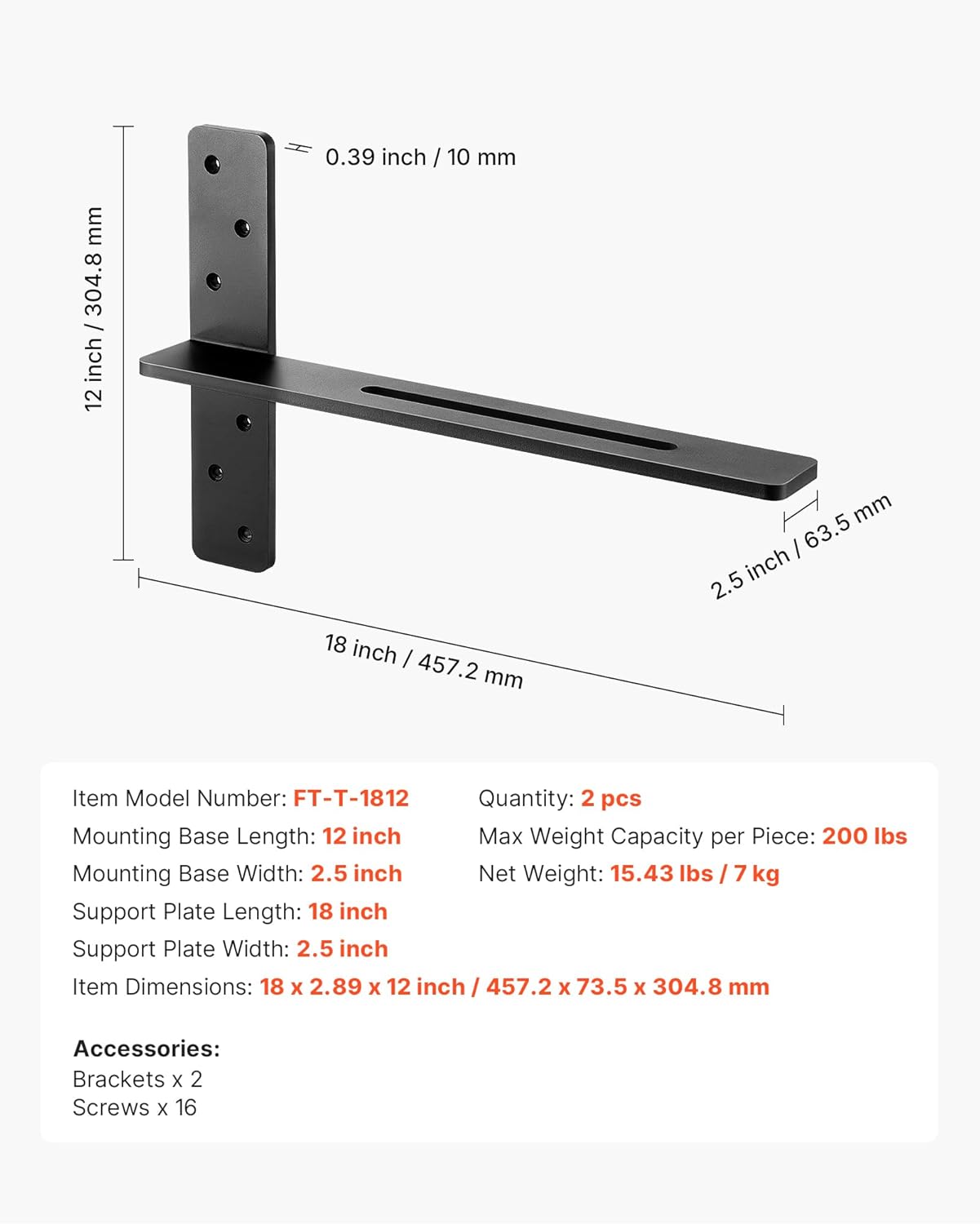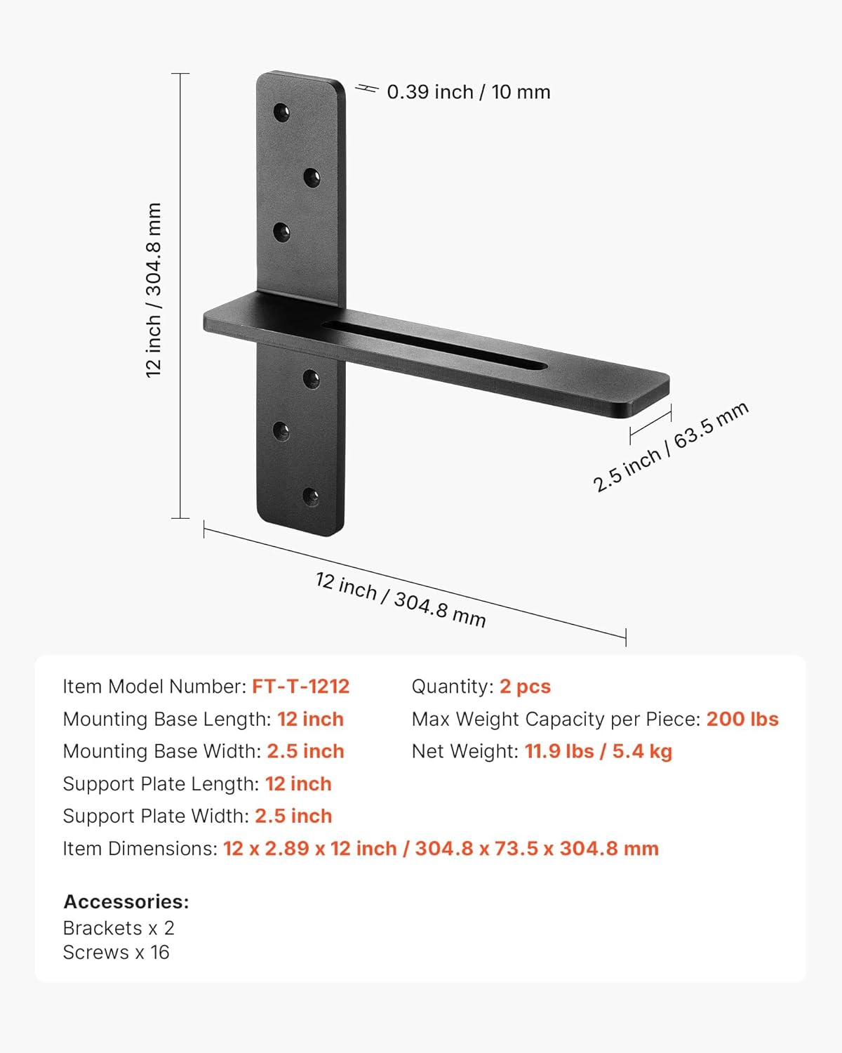 Strong Wall Support: Made from high-quality steel, these floating shelf brackets feature 3/8-inch thick steel in both vertical and horizontal sections, supporting up to 200 lbs. Strong and dependable, they hold heavy items securely and resist bending over time
