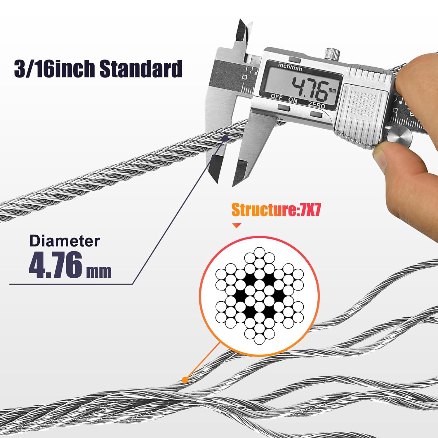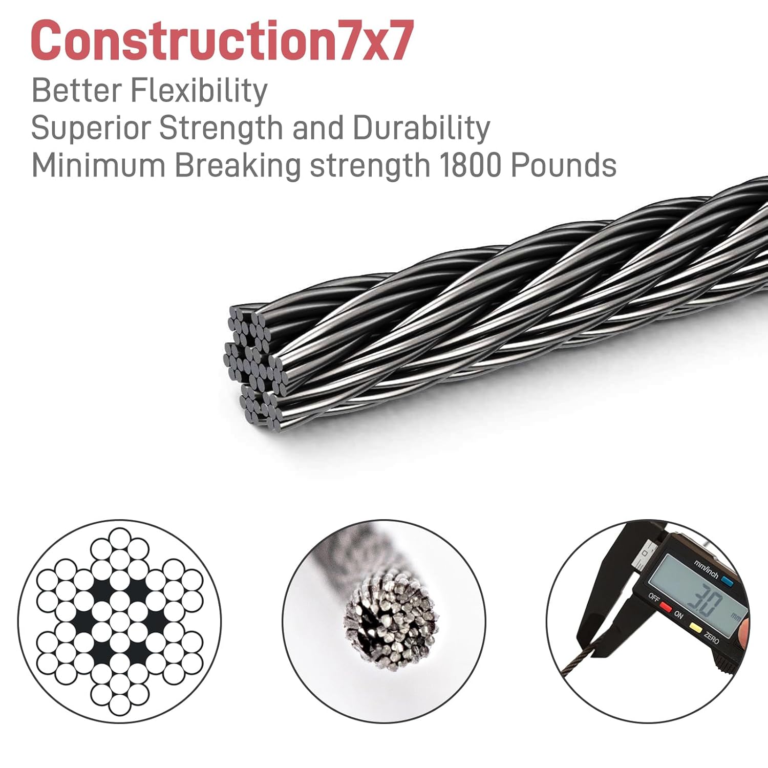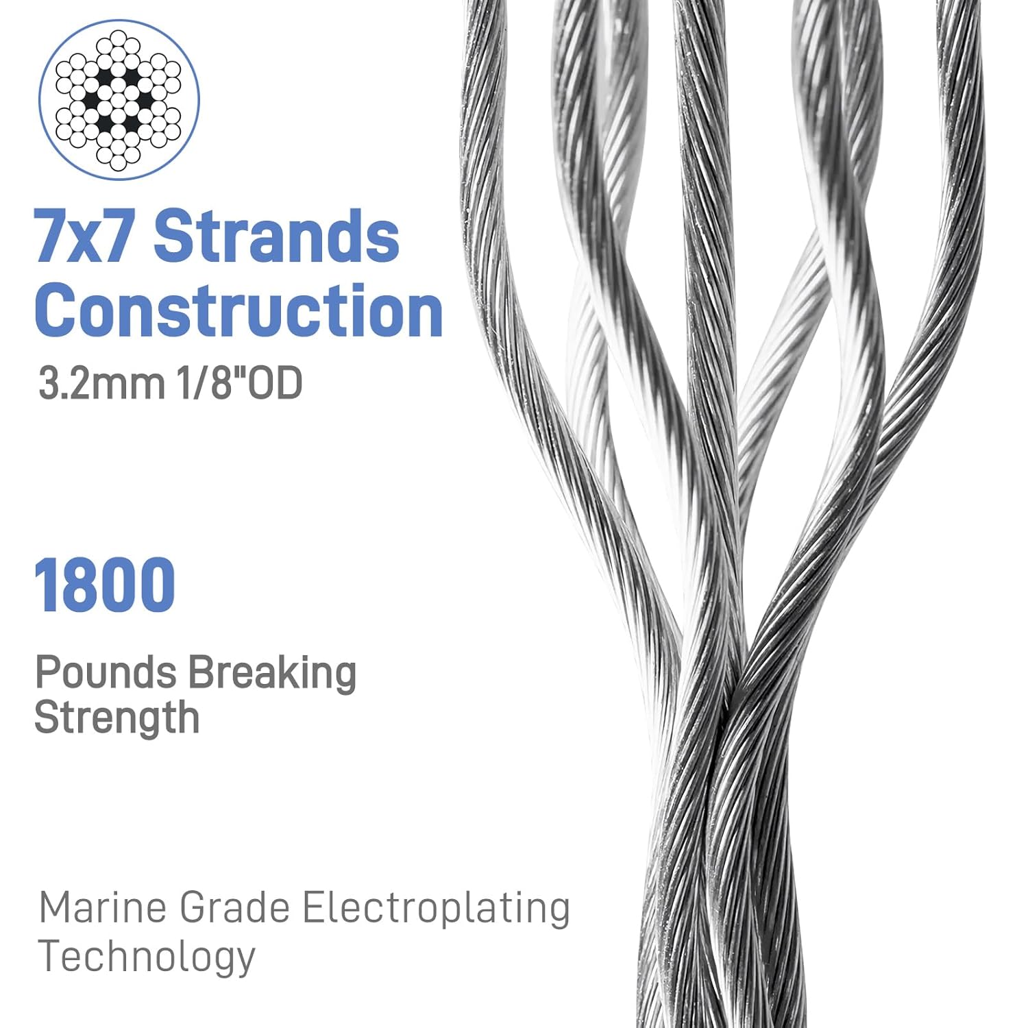 Sturdy Construction: Diameter=1/8 Inch, Length=1000 Feet, Breaking Strength=1800 pounds, Cable Construction-7x7. The safe tension in using is 260 pounds.